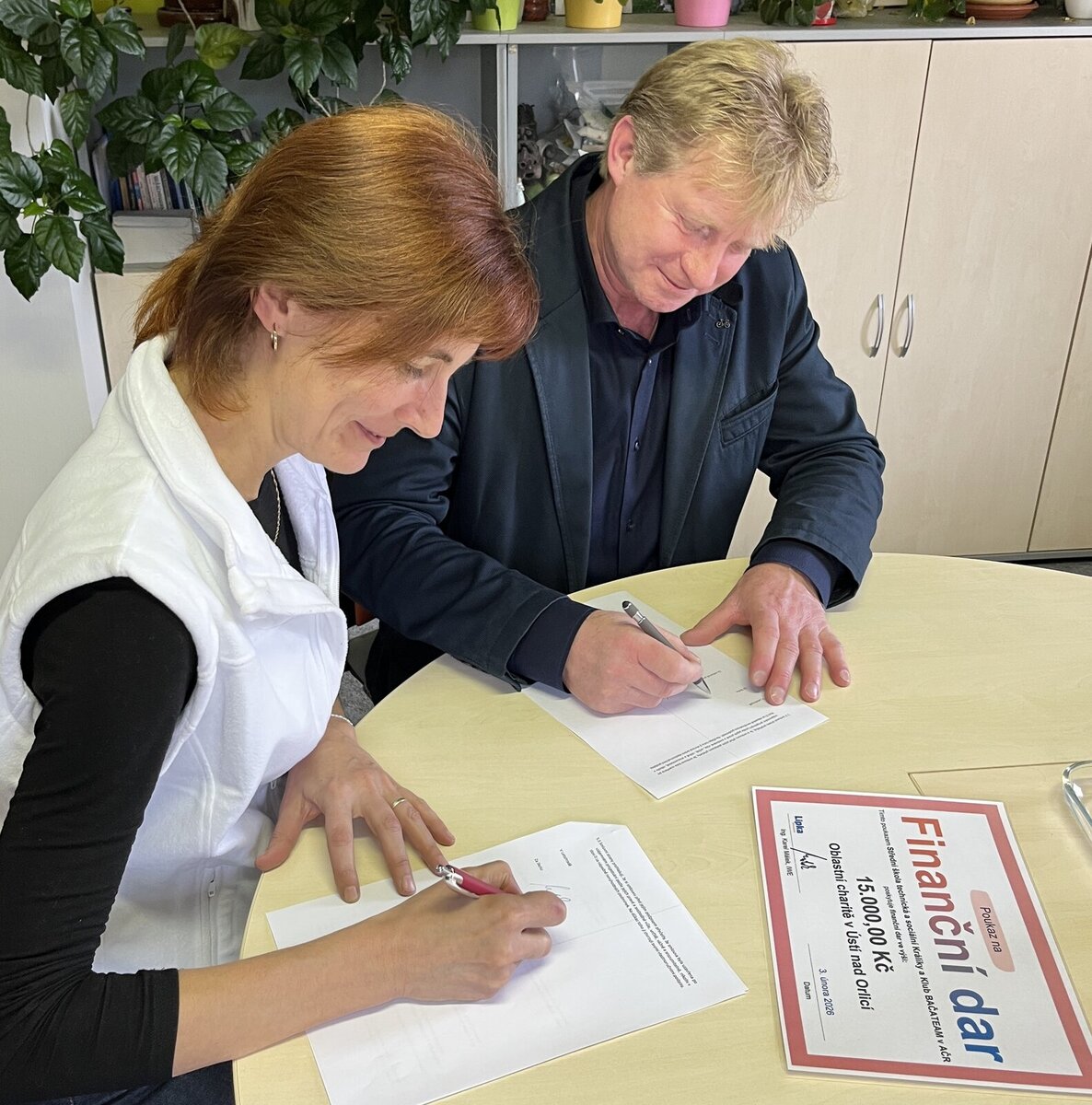 Protože v září se v SŠTS otevírá nový obor Sociální činnost, oba ředitelé zároveň podepsali smlouvu o spolupráci na praxích těchto studentů v Oblastní charitě.
